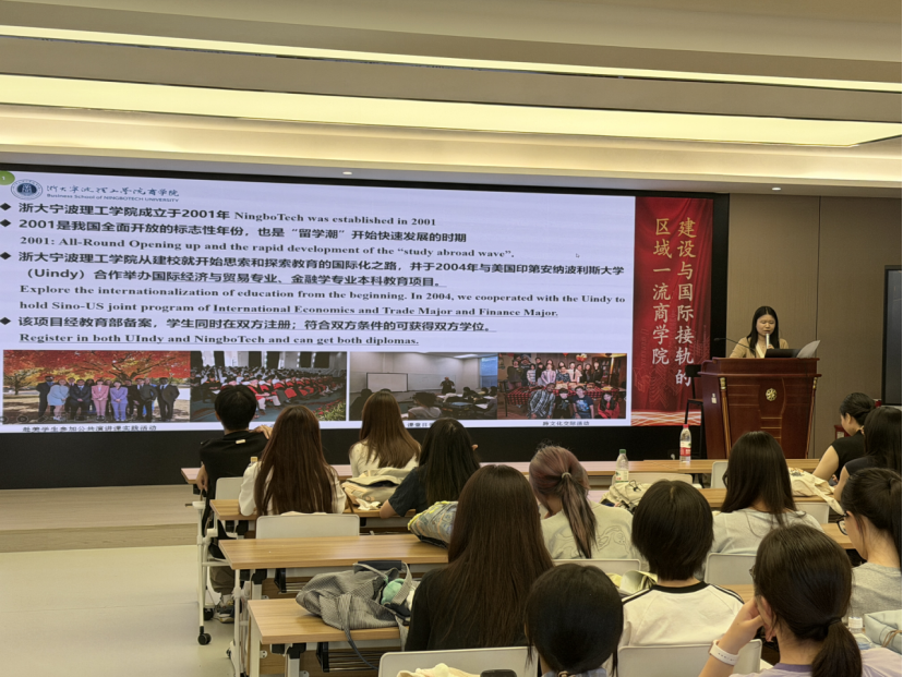 励呈仪老师总结了中外合作办学项目的特色及优势,详细解读了中美班在学籍管理规定和毕业、学位资格审核方面的要求,系统介绍了第三学年赴美申请的要求、流程及注意事项,鼓励学生强化英语语言学习,尽快适应全英文的授课环境,为顺利赴美学习打下坚实的基础。