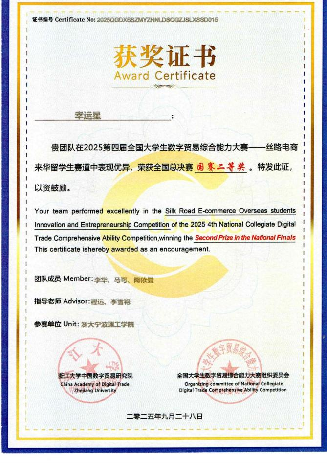 9月28日,由我们组织的国际学生团队在第四届全国大学生数字贸易综合能力大赛——“丝路电商”来华留学生创新创业大赛暨东方杯“我为家乡代言”(国际组)中荣获全国二等奖。作为宁波市唯一一支入围此赛道全国决赛的队伍,展现了我们国际教育的丰硕成果。